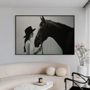 “Equine Elegance” captures the profound bond between human and horse in a minimalist yet powerful composition. Set against a soft monochromatic background, a poised woman in a sleek black hat and a majestic black horse stand together in harmony. The gentle interaction reflects trust, grace, and timeless beauty. Perfect for contemporary spaces, this artwork brings an air of sophistication and calm, making it ideal for living rooms, offices, or art galleries. Printed on premium canvas, it ensures lasting quality and stunning visual impact.